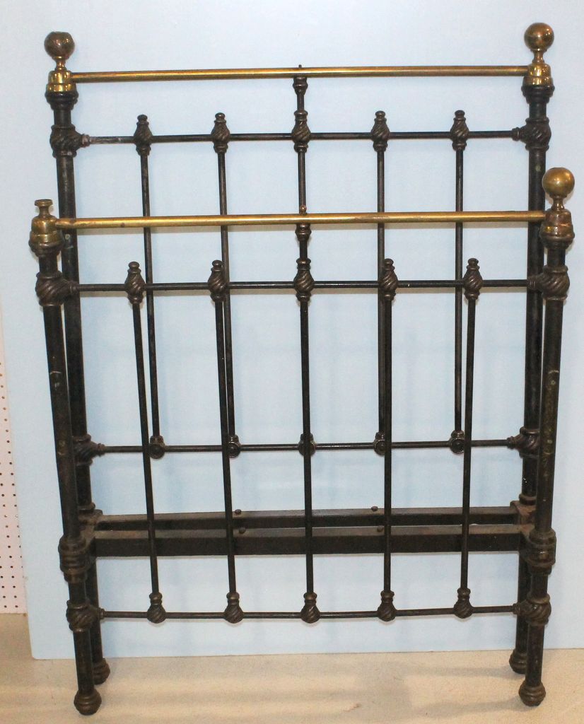 Antique painted black iron bed with brass top rail (one finial missing) iron rails; 51 1/2" h.