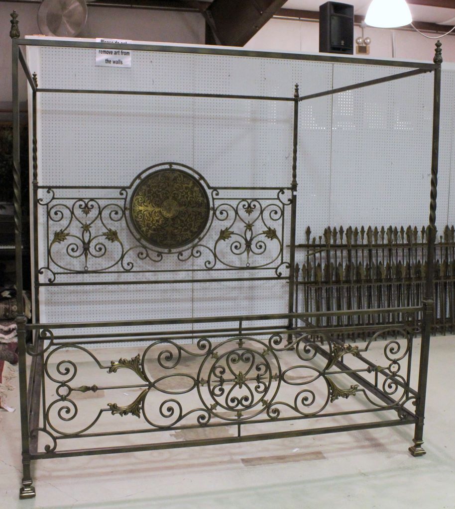 Contemporary King Size Iron Teaster Bed. Fancy headboard with medallion which has brass inlay. 84" h., 75" l., 80" w.