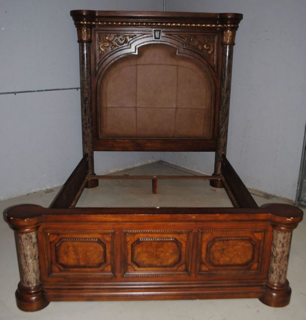 Contemporary Queen Size Bed. Marble post, padded fabric headboard, ornate gold insizing.