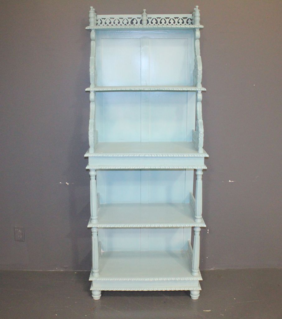Fancy Carved Five Shelf Blue Open Bookshelf; 77" h., 30" w., 17" d.