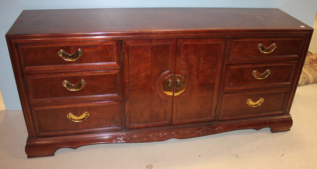 Contemporary console with tow doors having interior slide out drawers, flanked by three drawers on each side, 70"w., 18"d., 31"h.