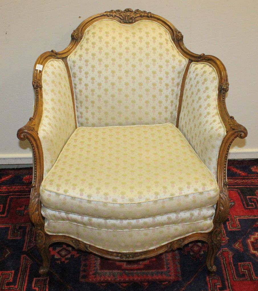French Style Upholstered Hand Carved Parlor Chair, 30"w., 30"d., 35"h.