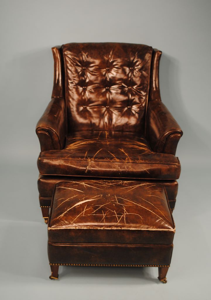 Club chair with wear on the seat and matching ottoman. Chair 34"h, 30"w, 30"d. Ottoman - 13.5"h, 23"w, 16"d.