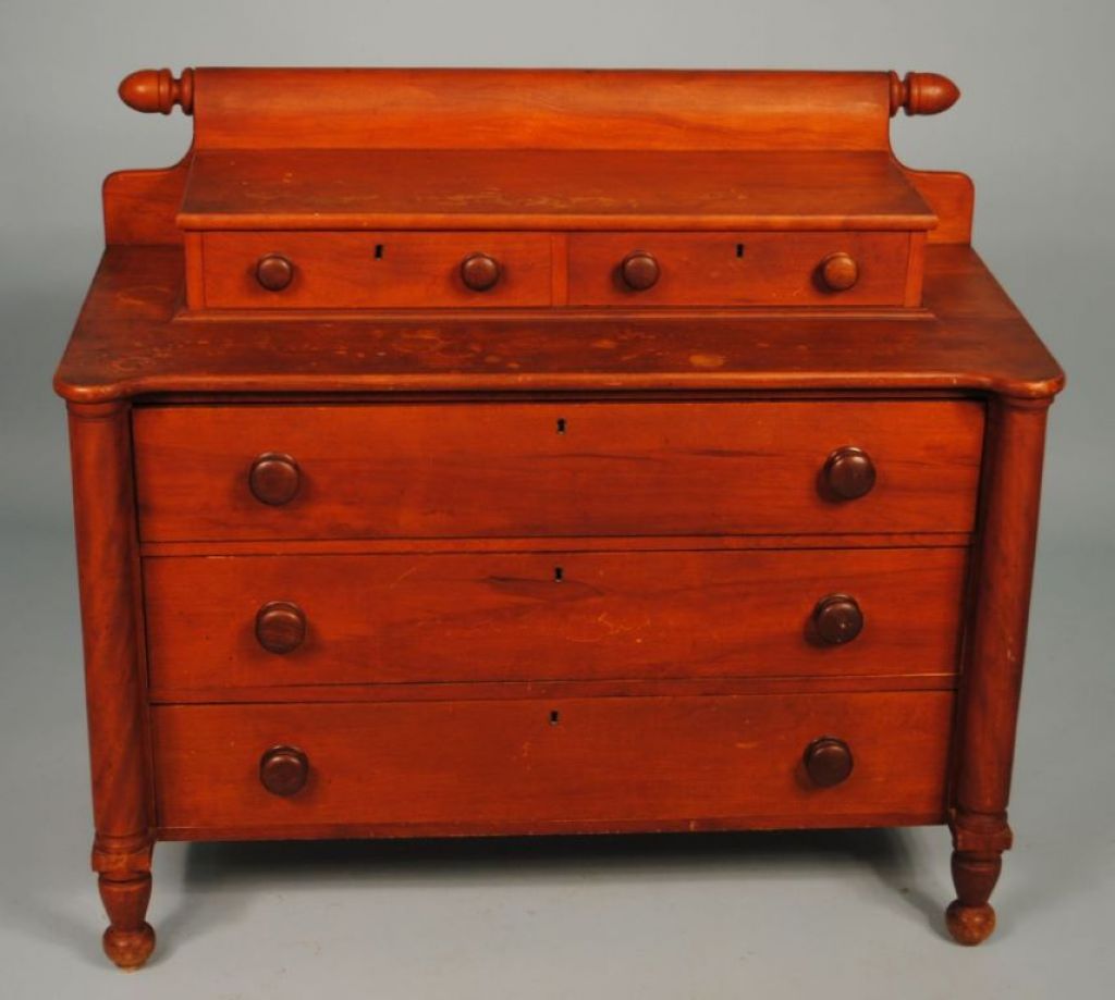 American Cherry Mule or Blanket Chest. Top step back with blanket roll, two drawers, base with three drawers flanked by columns, up on turned foot. 40"w 20 1/2"d 34"h