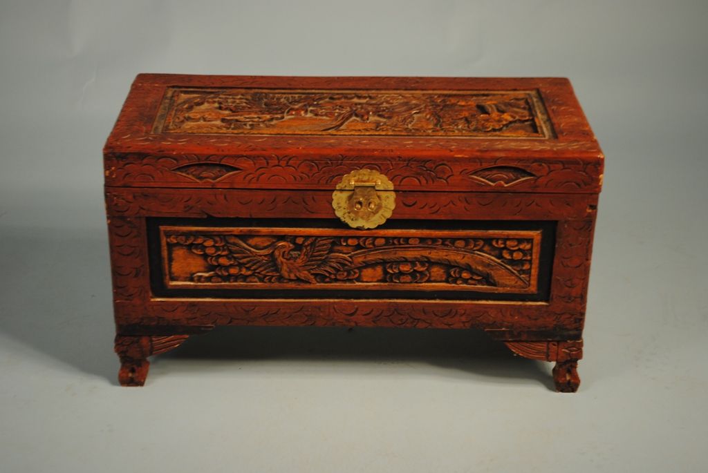 Carved trunk in the oriental motif. 27"w 13"d 15"h