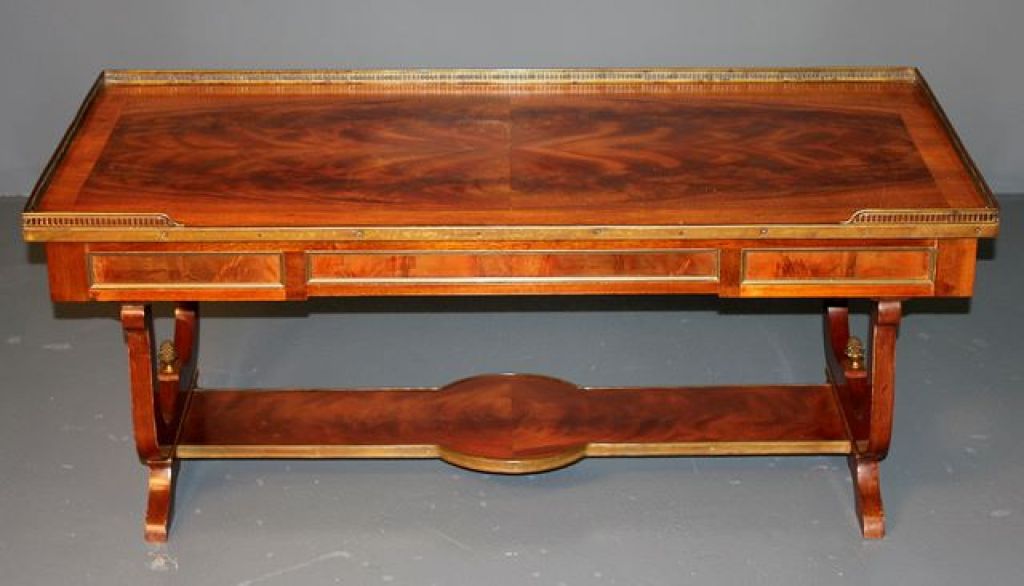 Duncan Phyfe Style Mahogany Coffee Table; with brass gallery, pull out drawer at each end, lyre legs with brass pineapple finials, and bottom shelf. 47 1/2" l., 22 1/2" w., 20" h.