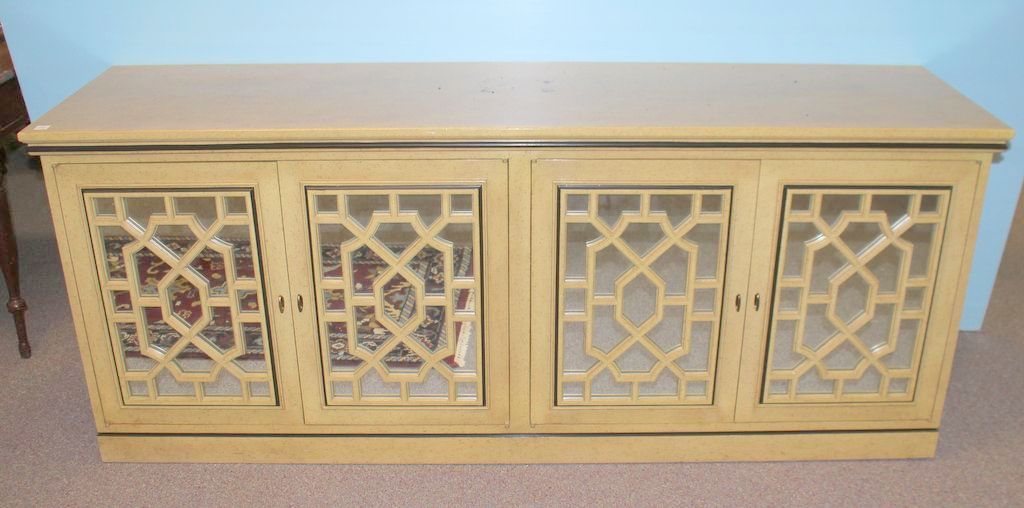 Contemporary four door console having elaborate latticework on doors with mirrored backs; 71 1/2" w., 20" d., 30" h.