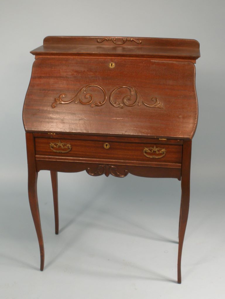 Mahogany Lady's Fall Front Desk 1910. Simple backsplash w/carving. Applied molding on front of fall front. Fitted interior, center drawer, apron supported by bowed legs. 29 1/2"w x 16"d x 43 1/4"h