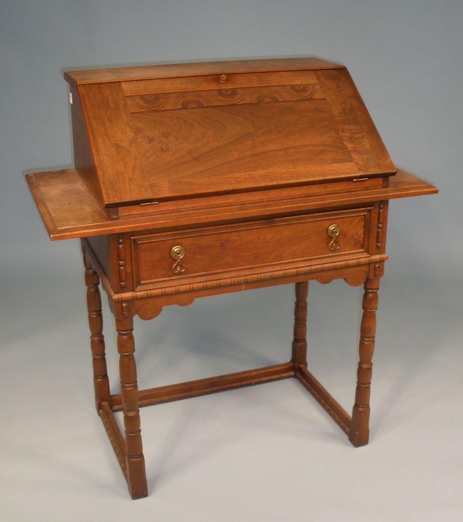 Unusual Walnut fall front desk w/fitted interior. Center drawer supported by spool legs. 36"w x 19"d x 35"h