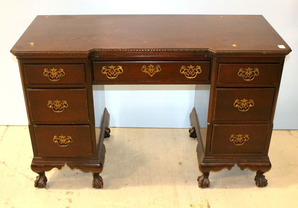 20th century mahogany ball and claw Chippendale style kneehole desk. Mahogany Associates, Inc. label inside center drawer; 48" w., 20" d., 31" h.
