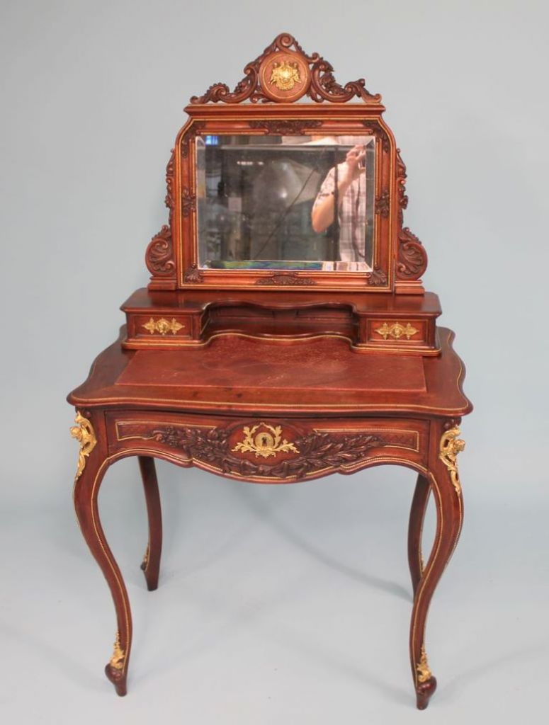 French Ormulu Writing Desk with beveled mirror, two drawers on top and one drawer under, all with fine carvings and gilt attachments. 56"h x 31"w x 21"d