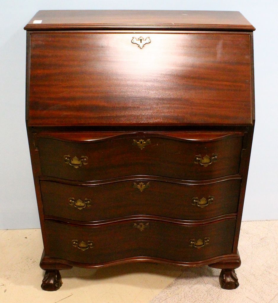 Mahogany, drop front, Chippendale style desk with serpentine front drawers, cubby hole interior; 30" w., 15" d., 40" h.