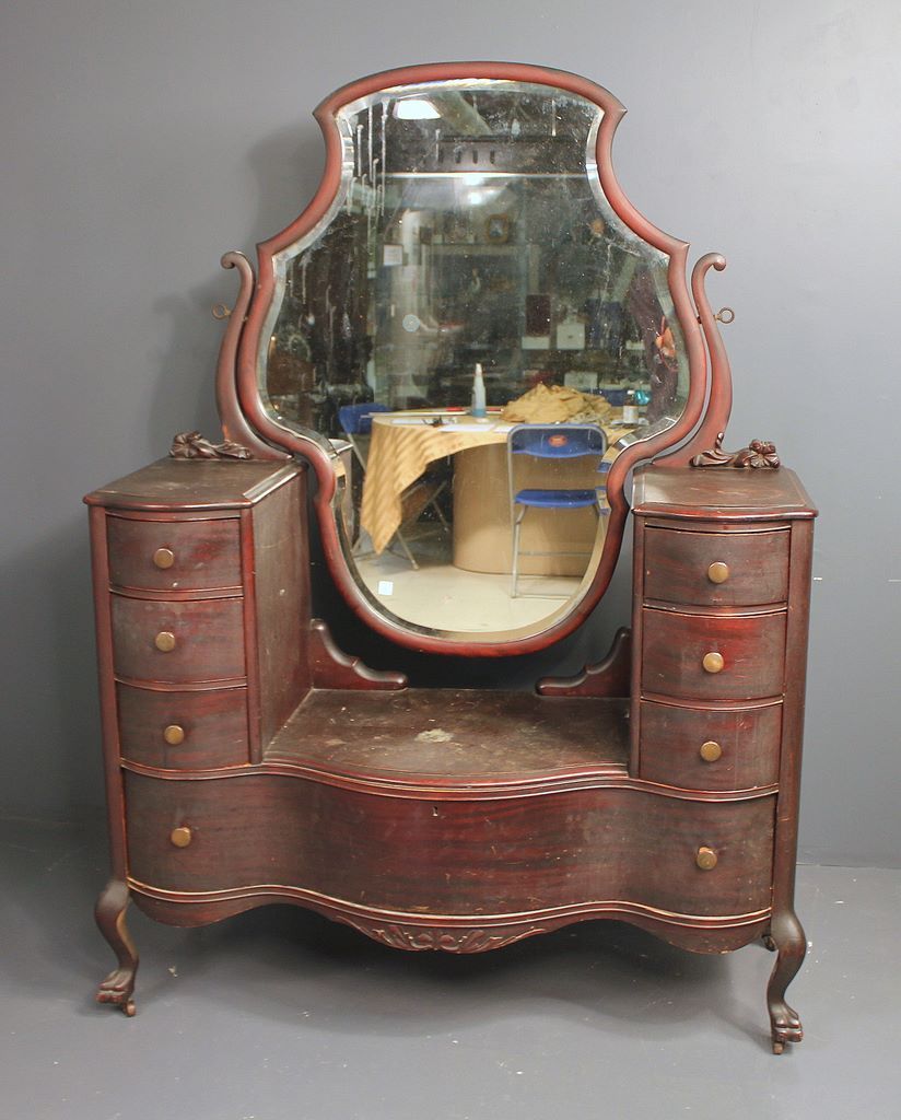 20th Century Mahogany Drop Center Dresser, three drawers on each side, long drawer across the bottom, top has beveled mirror supported by scroll arms; 53" w., 20" d., 89" h.