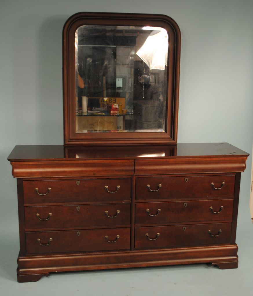 Empire Style Mahogany Broyhill Dresser. Two drawers over Six drawers with heavy beveled glass mirror. H. 36" W. 68" D. 18"