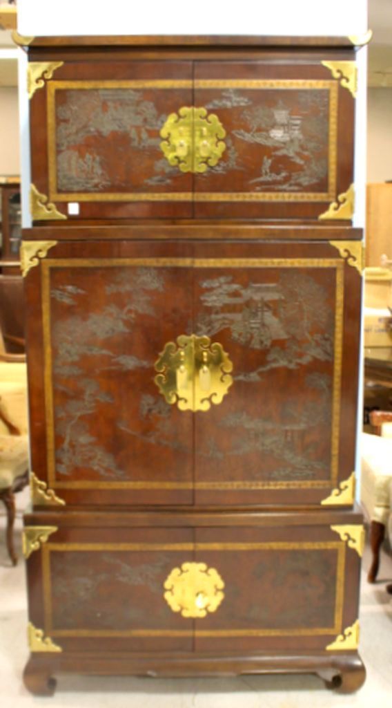 Lacquer entertainment center in the oriental design with accenting brass straps. 37 1/2" w., 23" d., 77" h.