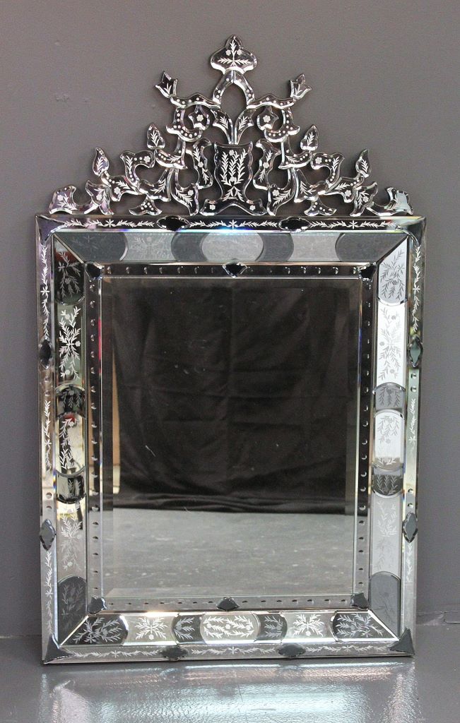 Beveled glass mirror with etched flowers, tear drops and elaborate etched pediment. 30 1/2" w., 50" h.