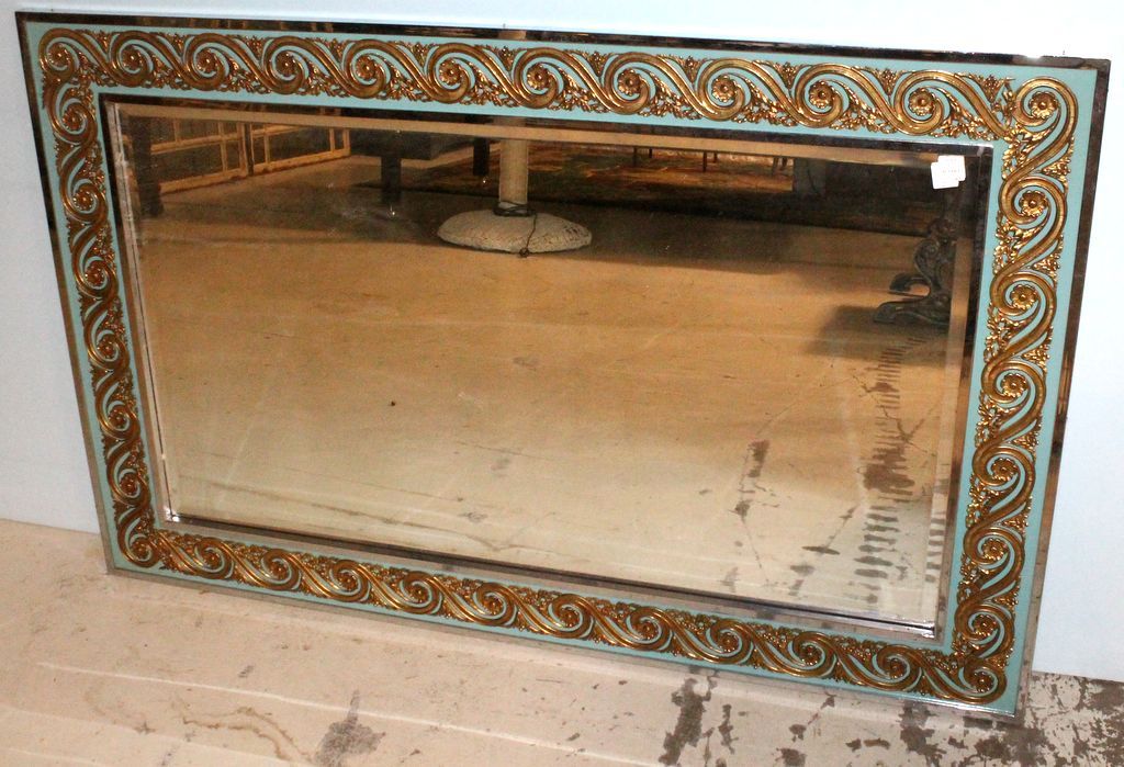 Decorative metal beveled glass mirror with ornate brass decoration; 48" w., 31" h.