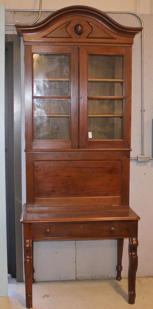 Walnut Victorian fall Front secretary with upper section having two glass doors, bonnet top, fitted interior and bottom section has drawer with curved Victorian legs 37"w., 22"d., 95"h.