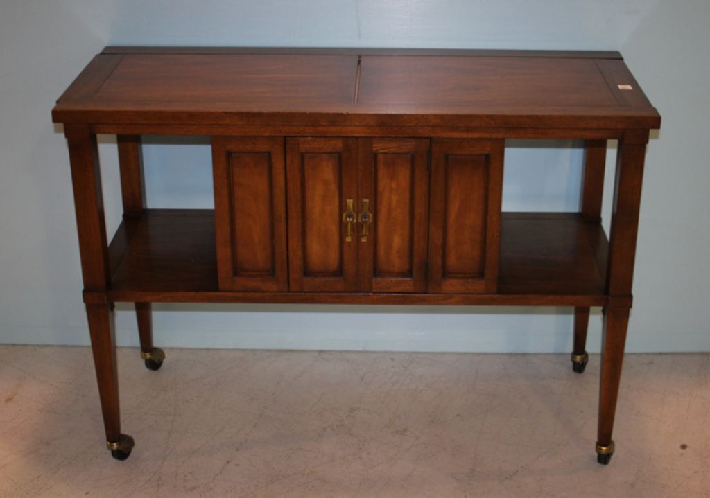 Contemporary Walnut Server, center door, two shelves supported by brass castors; 44" w., 18" d., 31 1/2" h.