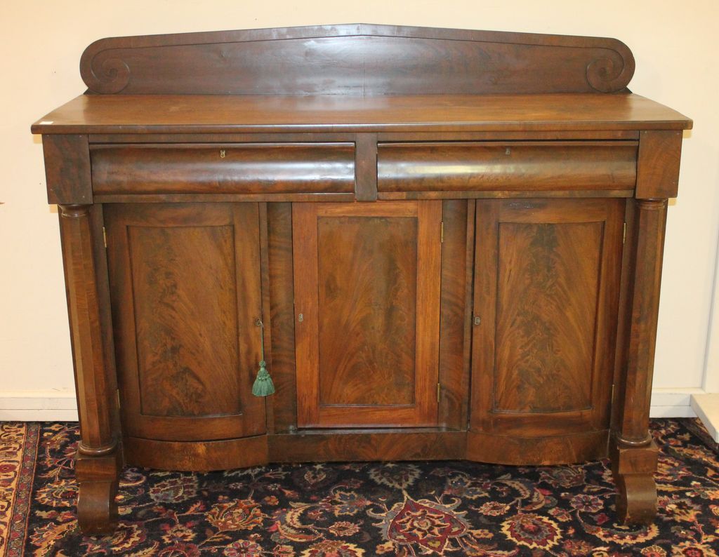 Circa 1840 Empire server with two drawers center door flanked on each side by cylinder doors, octagon columns, scroll feet, 60"w., 21"d., 49"h.