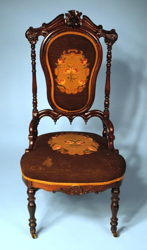 Victorian walnut side chair covered in needlepoint, 40"h x 20"