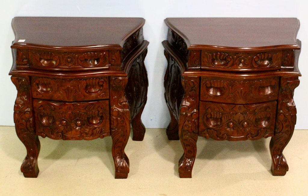Pair of heavily carved three drawer bed side tables with shell carved pulls; 25''w., 18''d., 28''h.