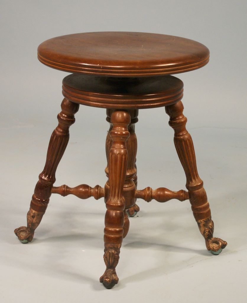 Walnut turn of the century piano stool w/glass ball feet, 14 3/4" round x 18"h