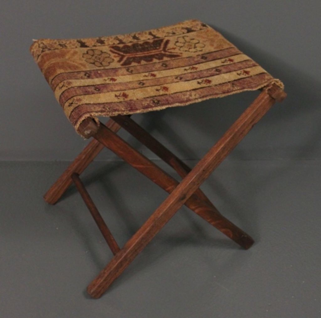 20th century folding stool with carpet on top. 14 1/2" w., 13" d., 15 1/2" h.