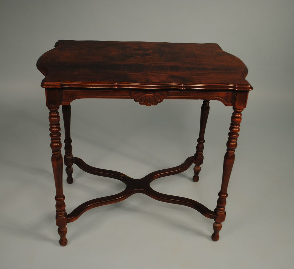 1940's walnut parlor table. Rectangular scalloped top with shells carved in each side supported by simple stretcher, turned legs. H. 29 1/2", W 27 1/2", Dia. 19"
