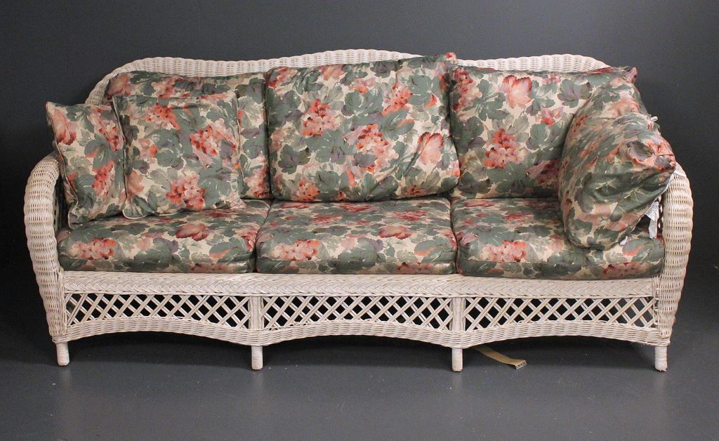 Set consists of sofa covered in floral cotton, three cushion (80" w., 31" d., 33" h.) arm chair, cushion covered in same fabric (30" w., 29" d., 34" h.), oval glass top coffee table (40" oval, 16" h.), oval glass top table (26" oval, 24" h.) rectangular ottoman with cushion (28 1/2" w., 18" d., 13" h.)