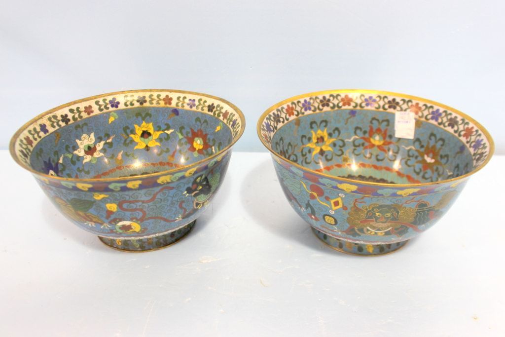 Unusual pair of Chinese cloisonne wedding bowls in blue ground decorated with flowers and dragons; 10" dia., 5 1/2" h.