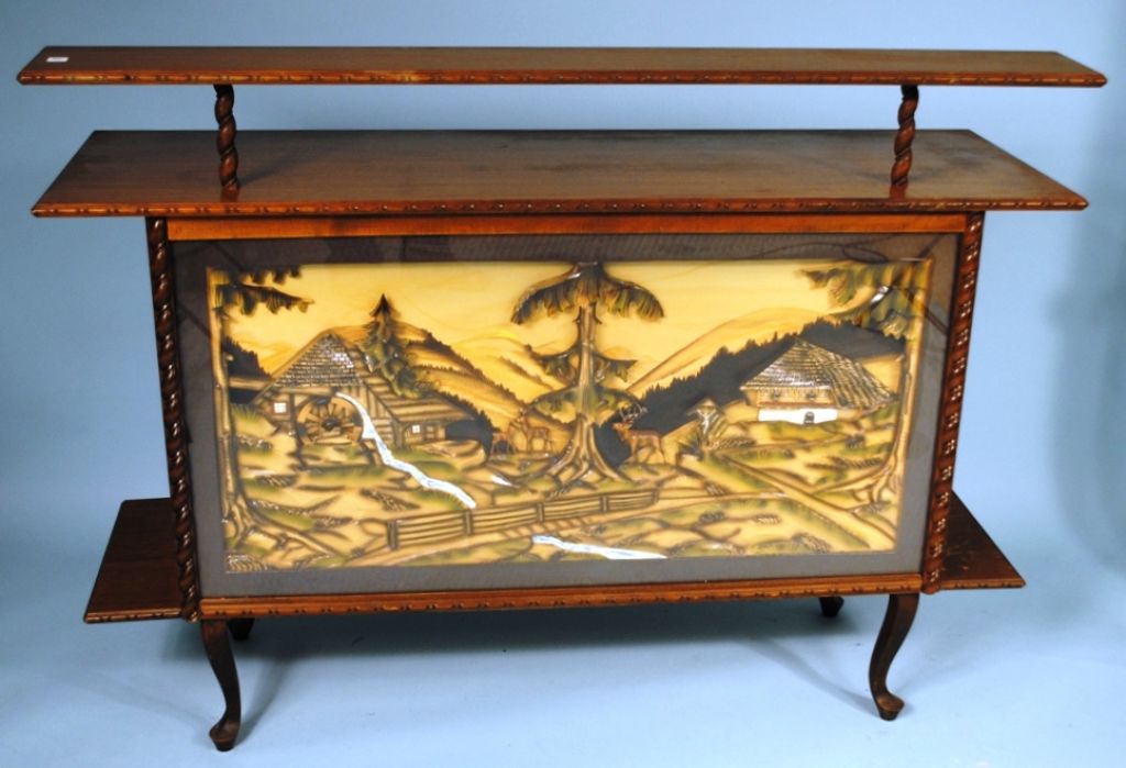 Vintage Bar, two tier with glassed in area with plastic oriental scene; 59" w., 19 1/2" d., 44" h.