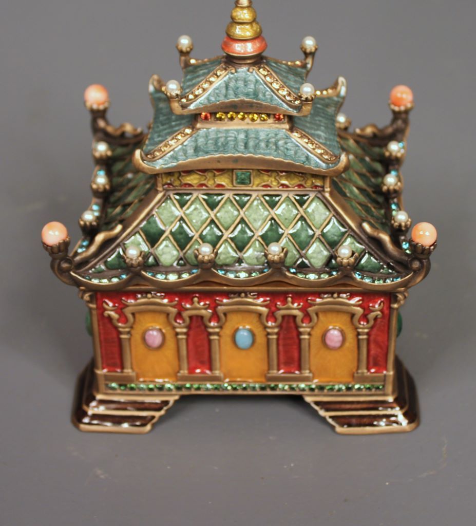 Jay Strongwater Limited Edition Pargoda Box , done in enamel. 4 1/4"w., 4"h.