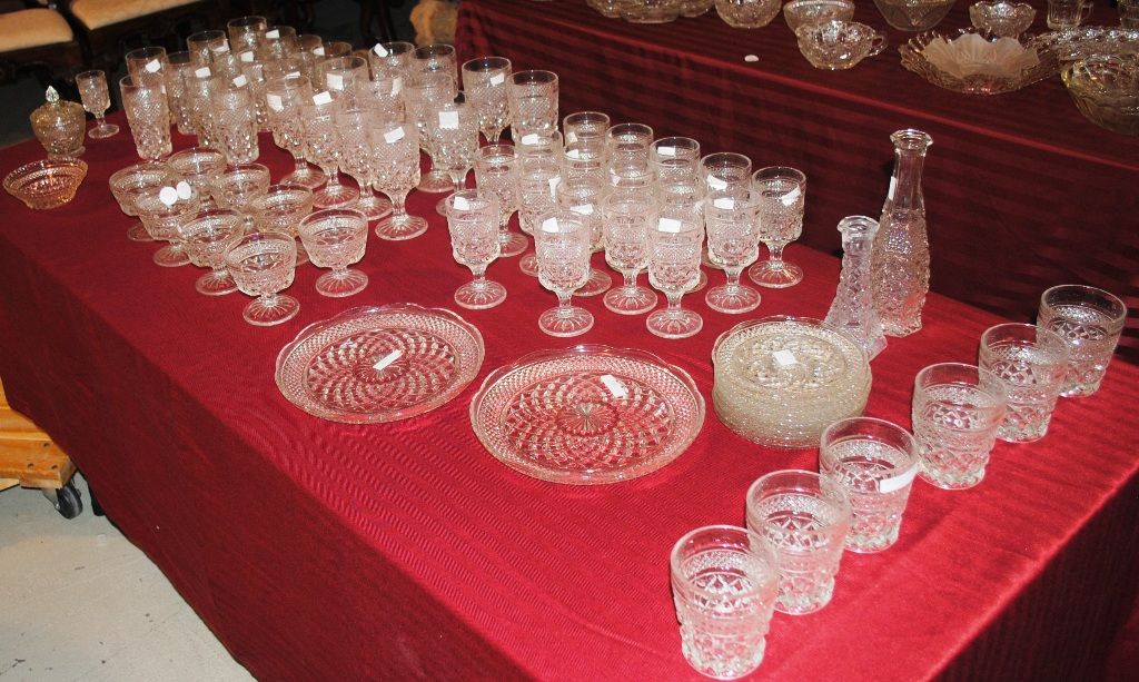 A collection of 72 pieces of Anchor Hockings early American "Wexford" pattern, including 13-5 1/2" tumblers, 12-6 1/2" water goblets, 17-5 1/2" wines, 6-4" highball tumblers, 1-4 1/2" cordial, a covered sugar bowl, 2 vases, 2-9 1/2" plates, 9-6" plates, 8-3 1/2" sherbets, a 5 1/2" bowl and an ashtray