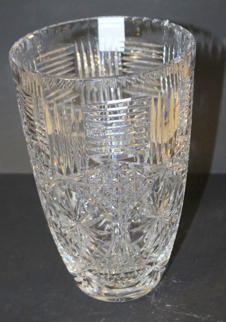 Large hand cut glass crystal vase with stars and diamonds; 10" h.