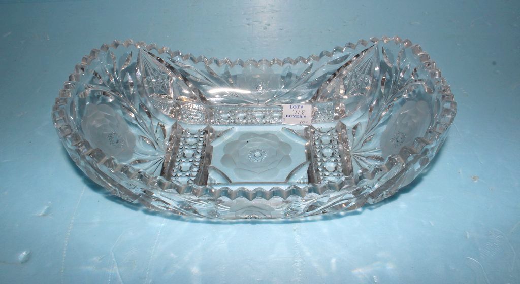 Early twentieth century cut glass banana boat bowl with etched flowers. 11 1/2" w., 6 1/2" d.