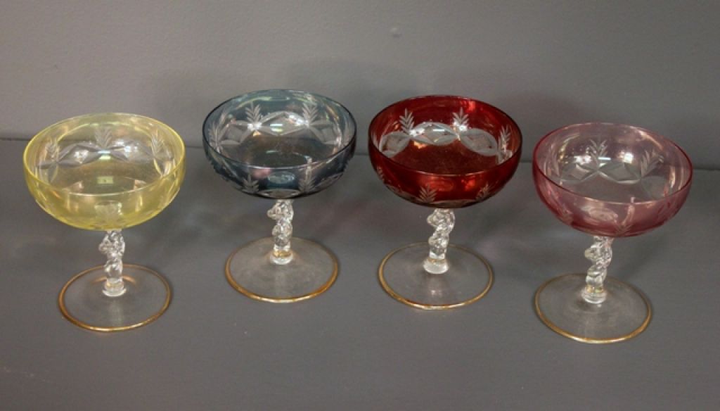 Yellow, Blue, Cranberry, Lavender Vintage Champagne glasses with twisted stems. 4"h.