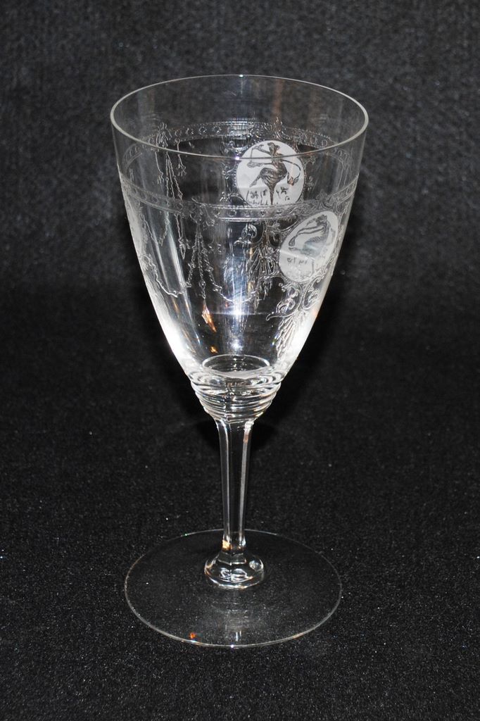 Set of 6 Heisey #3350 "Wabash" 10oz goblets w/#439 "Pied Piper" etching, signed stem