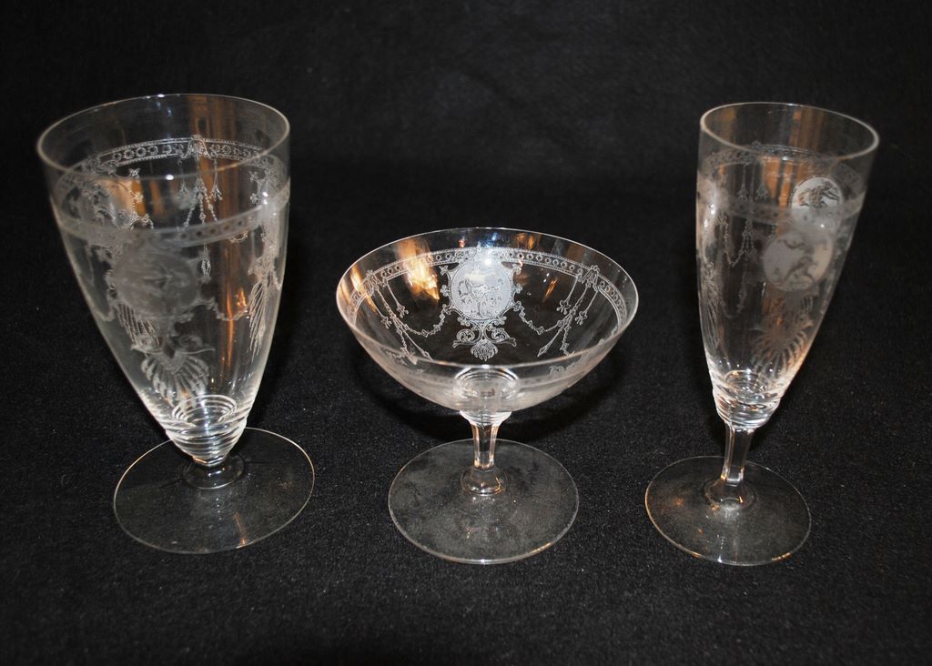A set of six Heisey #3350 Wabash 6 1/4"h "Pied Piper" parfait stems (signed), together with a matching 6"h iced tea tumbler and three 3 1/4"h sherbets (signed). Iced tea, sherbets and three parfaits have a speck nick to rim.