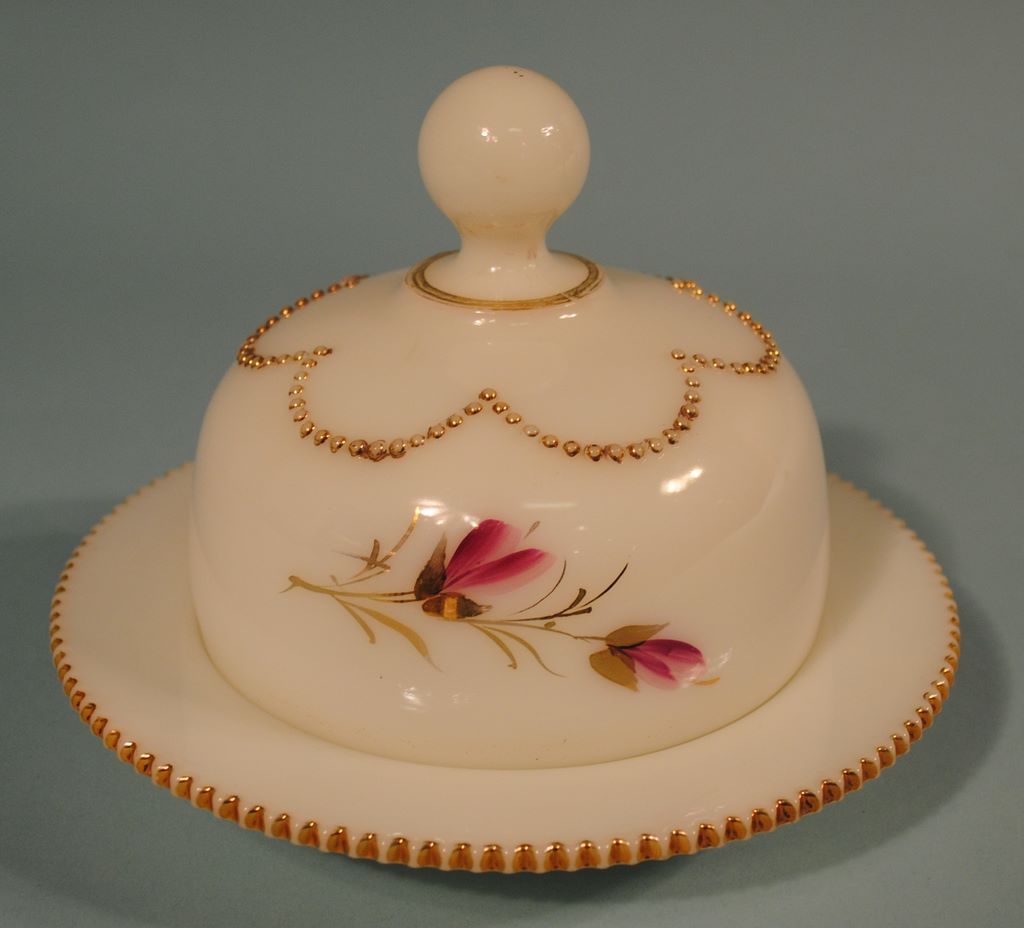 Early Heisey Opal "Beaded Swag" covered butter dish w/gold and floral decoration