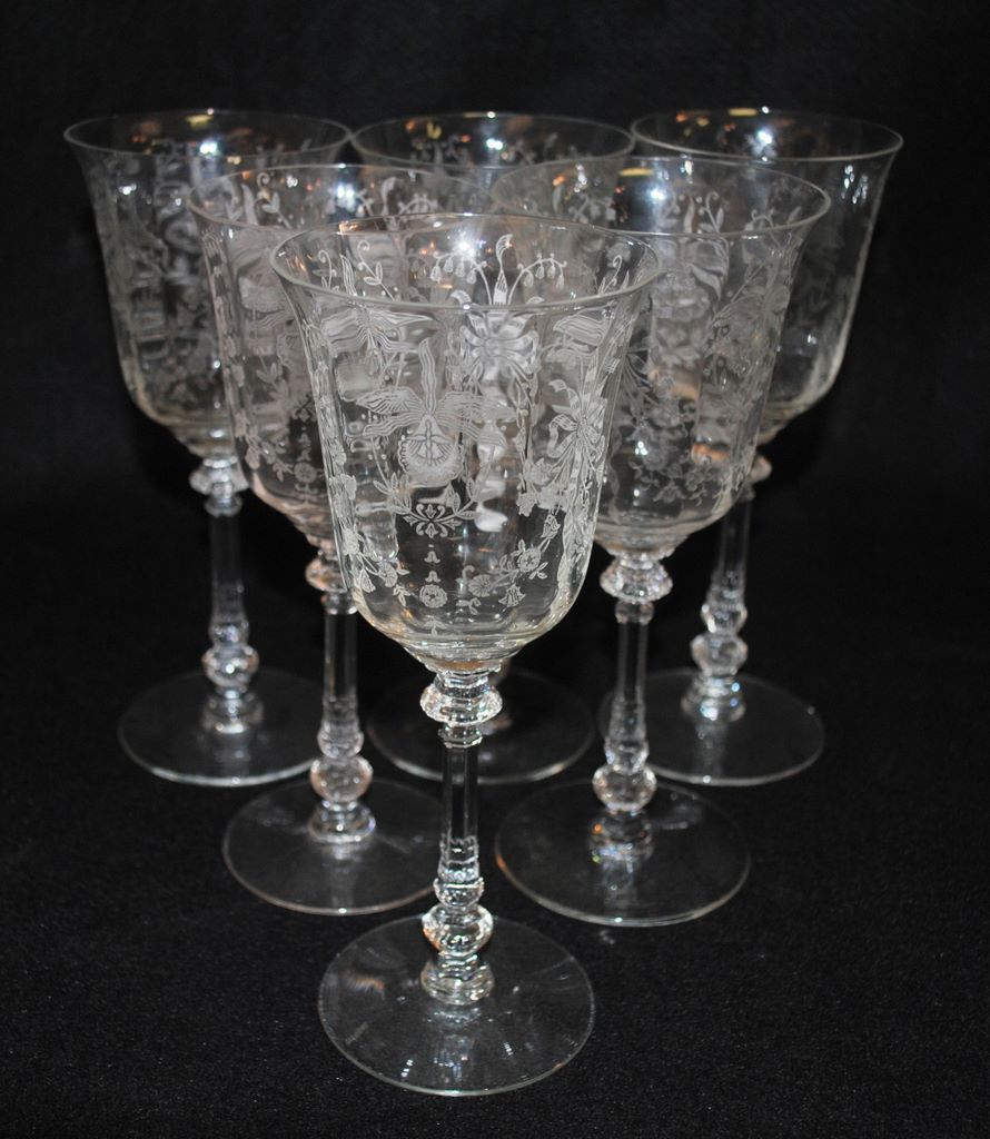 Set of 6 Heisey Crystal "Orchid" 10oz 8"h Water Goblets w/#5025 stem, one stem with professionally polished rim, one with factory flaw/speck nick 1/8" below rim