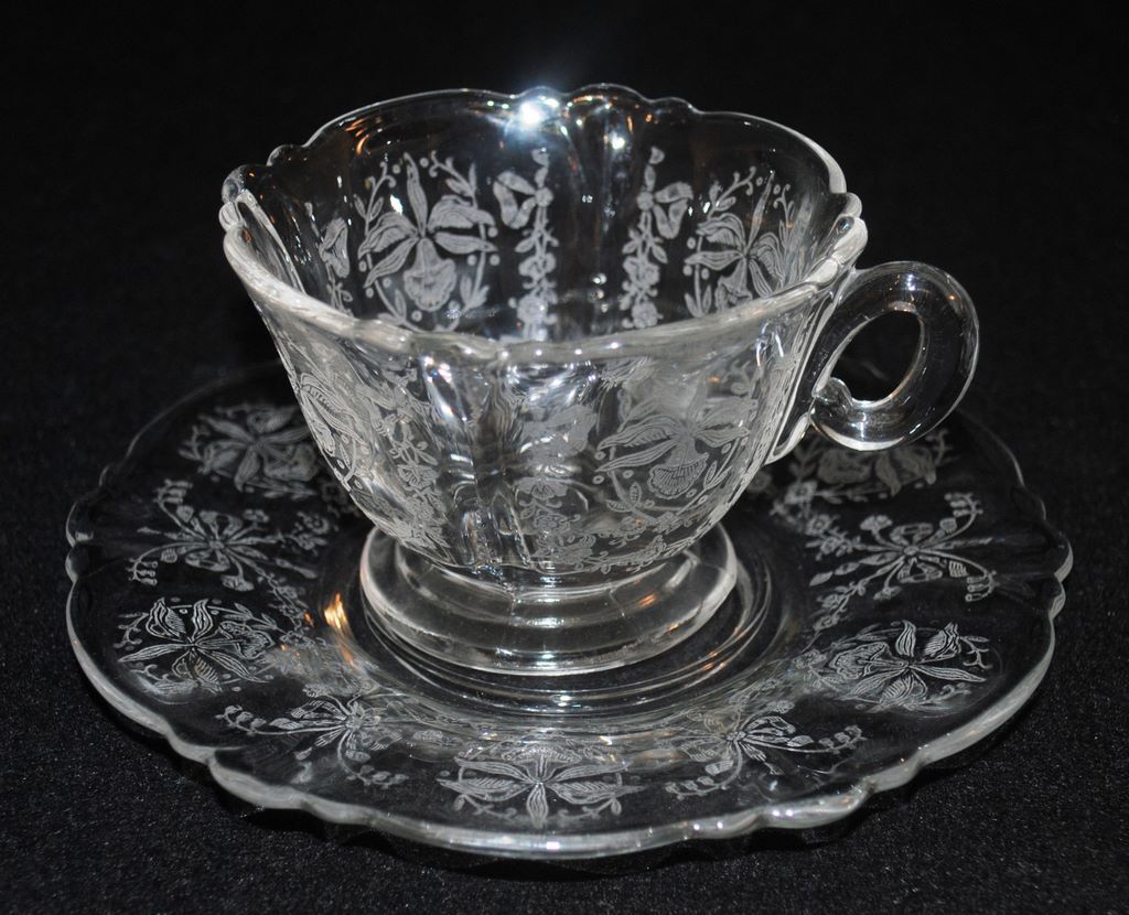 Set of 8 Heisey Crystal "Orchid" cups and saucers on Queen Anne blank, all signed