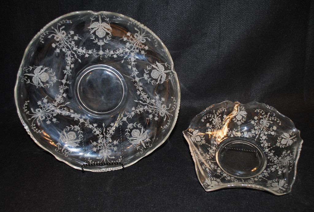 Two Heisey crystal "Orchid" bowls. 13" shallow gardenia bowl and 9 1/2" crimped floral bowl, both Waverly blank