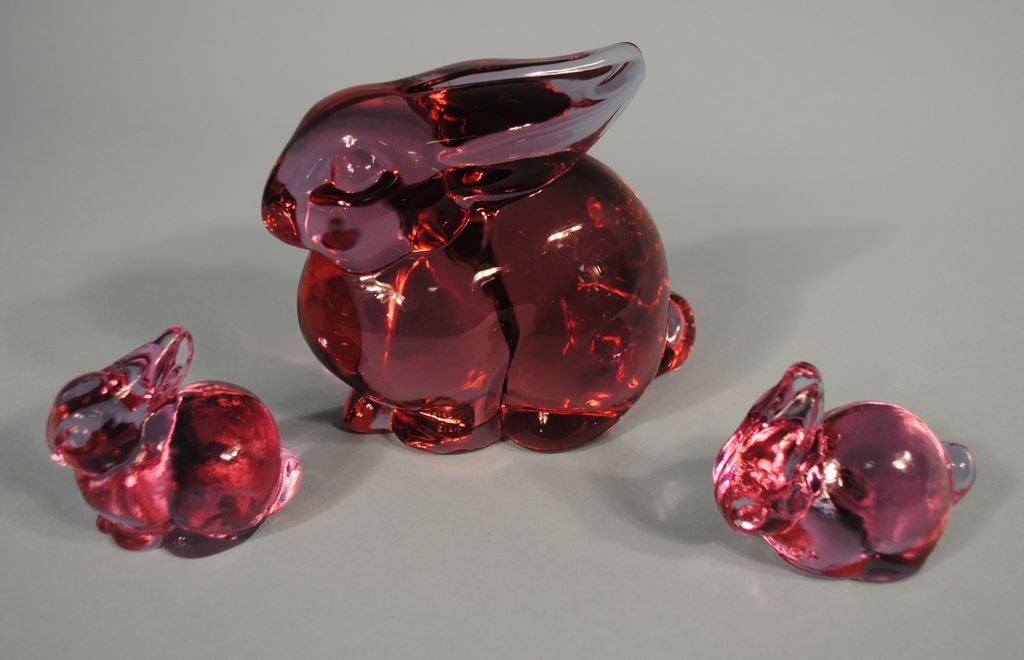 A three piece Heisey Mother & Bunnies rabbit group in Lavendar Ice produced in 1994 for the Heisey Collectors Association by Dalzell Viking
