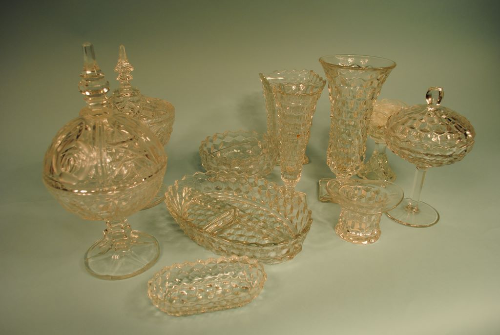 11 Piece Glass including three German cut glass compotes (8 1/2", 11", 12 1/2"); Early American pressed glass child's punch bowl w/6 original cups (6"); Fostoria "American" relish dish (10 1/2" x 7"); three Fostoria vases, one 8 1/2" bud vase, one 10" vase, one 7 1/2" square vase; Fostoria 3" hat vase, 5 1/4" x 3"; Fostoria Dish 6 1/2" round; Fostoria Bowl