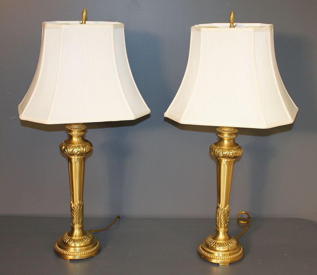 Pair of Satin Brass Contemporary Lamps with Shades, lamps made by Fairlane Lighting, fluted columns, leaves and beading. 31" h.