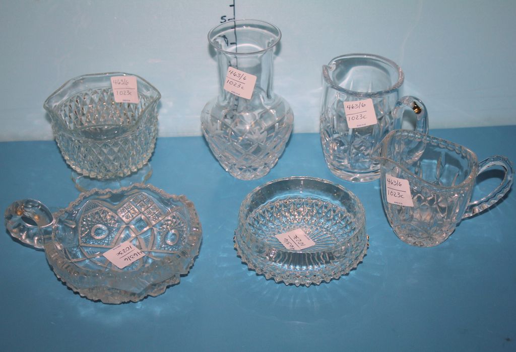 Six Pieces of Glass Including Waterford Milk Pitcher (4" h.), a Dish (4" dia.), a Crystal Vase (5 1/2" h.), a Pressed Glass Nappy (6" dia.), a Pressed Glass Pitcher (3 1/2" h.), and a Pressed Glass Sugar (3 1/2" h.)