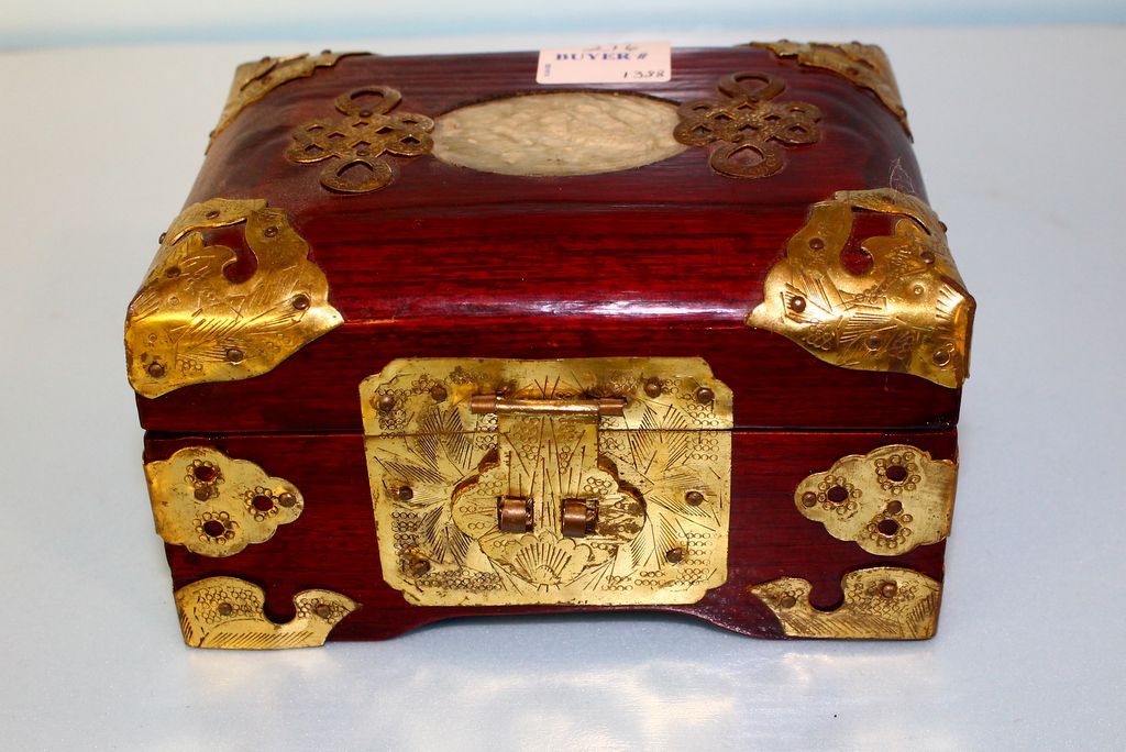 Small Chinese design jewelry box with brass straps and oval wood carved medallion on lid, 5 1/2" w., 4" d., 2 1/2" h.