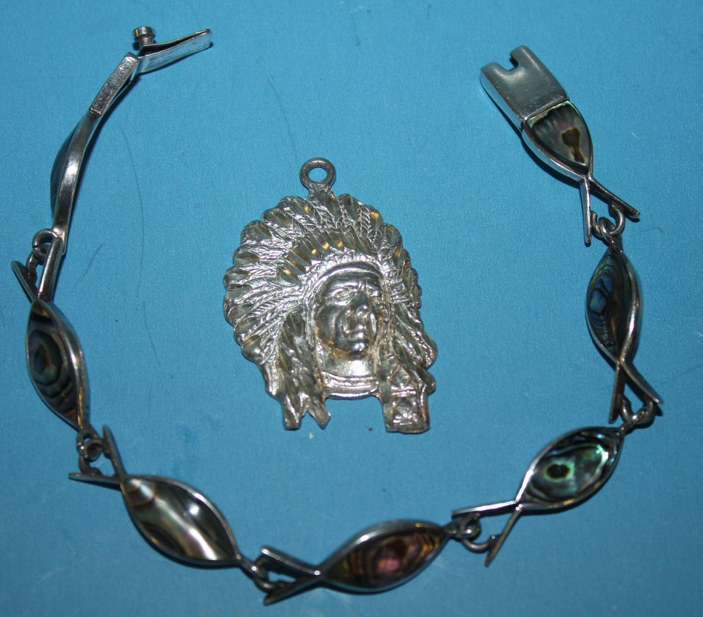 .925 Indian Head Drop, a Texaco .925 Mexican Bracelet with Faux Multi-Colored Pearl Insets