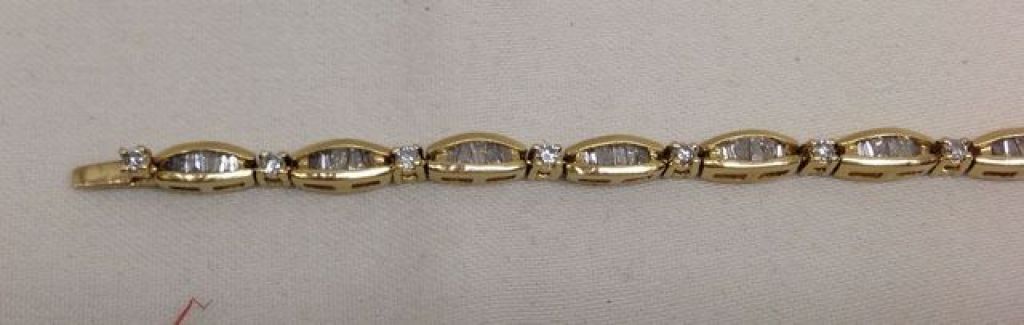 One stamped 14KT yellow gold lady's cast diamond baguette tennis bracelet with a 14k hidden clasp with a bright polish finish. Containing: Eighty-five channel set baguette cut (tapered) diamonds, measuring from 1.70 x 0.70 x 0.60mm (depth est.) to 2.20 x 1.50 x 1.28mm (depth est.) approximate total weight of 85 stones = 1.56ct. Clarity- SI-2 to I-1; Color- H-J; Cut- Good. Total Weight of Diamonds 2.06ct. Total Weight of Tennis Bracelet 6.40 dwt